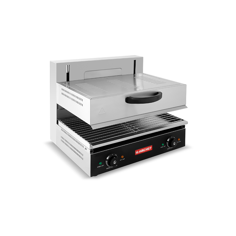 ES-600L commercial electric salamander 4KW features 300°C max temperature, 600mm baking area & energy regulator. CE certified. Ideal for restaurants, bakeries. 220-240V/50Hz.