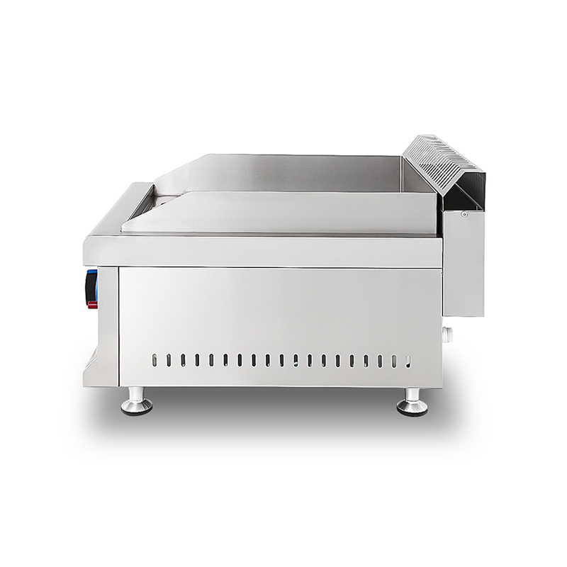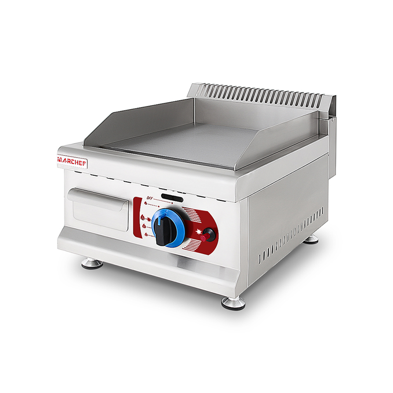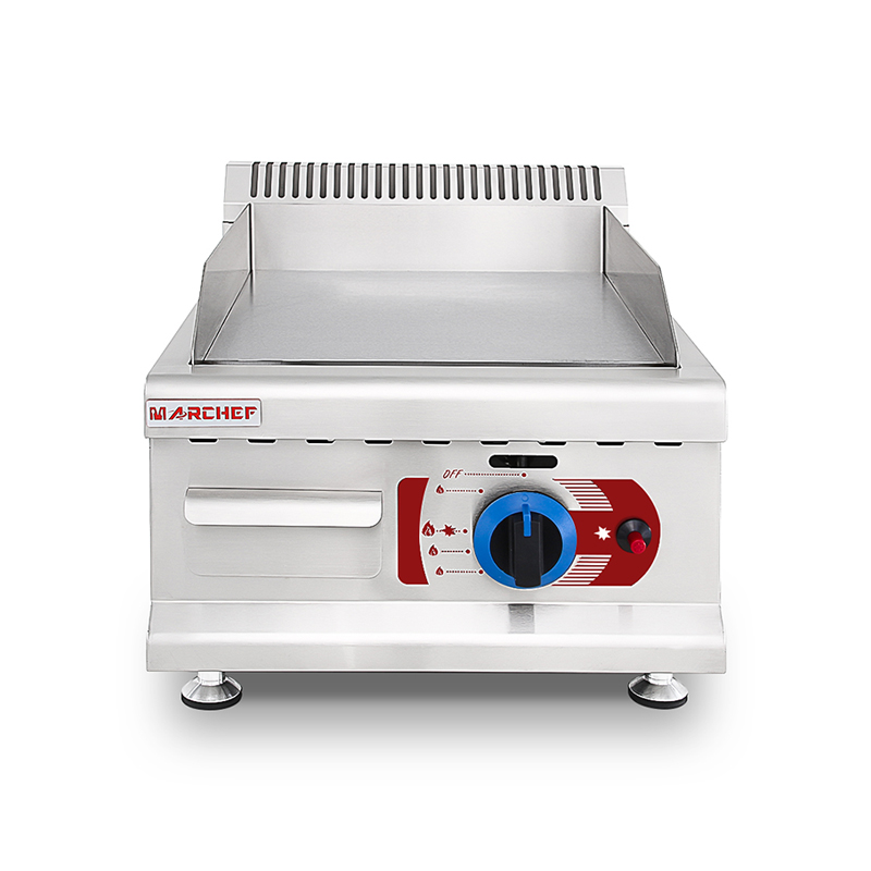 Powerful 2.7kW LPG grill with 10mm thickened cooking plate. Commercial-grade stainless steel construction with safety flame protector. Compact 415×570mm footprint perfect for small kitchens.