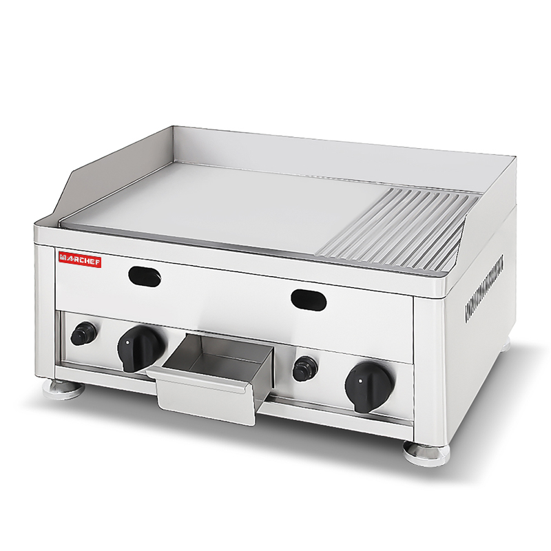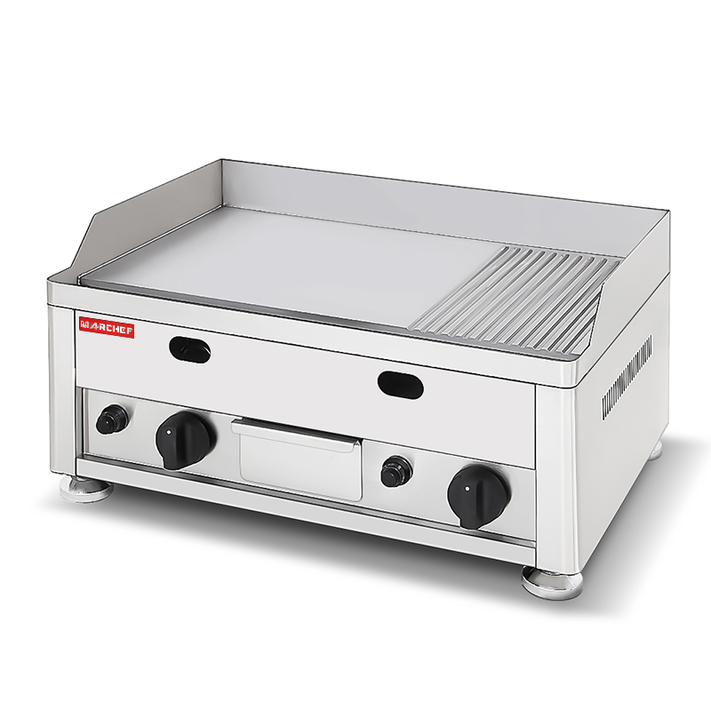 Professional 5.4KW LPG flat top griddle with 16mm thick cast iron cooking surface. Dual burner system delivers even heat distribution. CE certified with flame failure protection. Perfect for high-volume cooking in commercial kitchens.