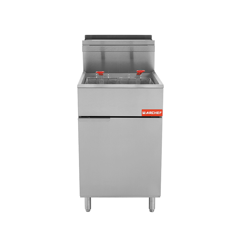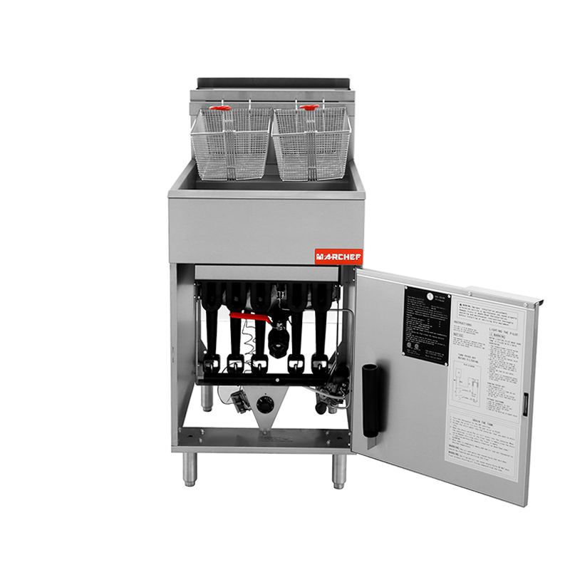 Professional-grade MGF5 gas fryer features 5 heavy-duty 30,000 BTU burners, 70L welded stainless steel oil tank, and precision thermostat (200°F-400°F). CSA certified for safety with oil cooling zone technology.