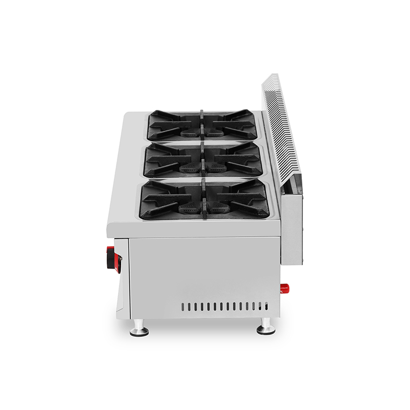 Professional-grade 3-burner gas stove delivering 75,000 BTU/hr cooking power. Features cast iron grates, stainless steel construction, and essential safety features for commercial kitchens.